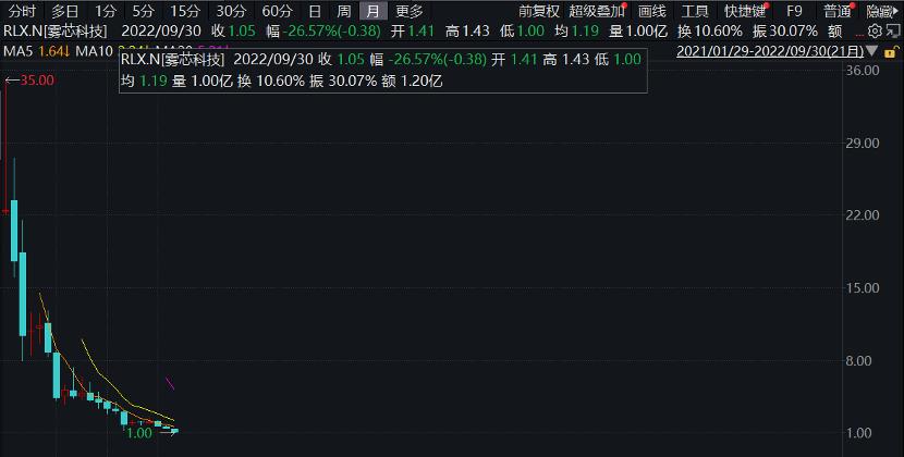其中,RELX(悦刻)是深圳雾芯科技旗下电子烟品牌。作为国内第一大电子烟企业。2021年1月,雾芯科技在美国上市,发行价12美元,开盘价报22.34美元,股价一度涨到35美元。同年2月开始,股价一路下跌。截至9月23日,雾芯科技股价已经跌至1美元左右。