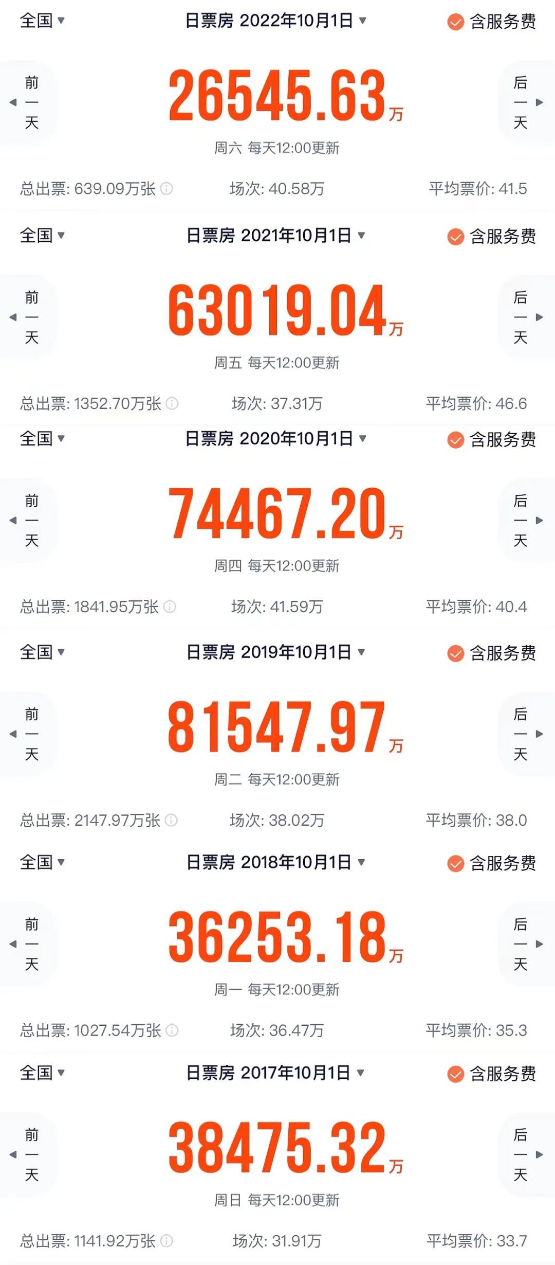 从票房和观影人次来看,昨天去看电影的人并不如往年多。灯塔专业版显示,10月1日单日票房2.65亿,观影人次也只有639万。单说数字可能冲击力不够强,和往年做一下比较就能有更直观的感受: