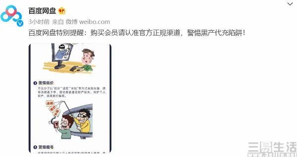 然而,百度网盘同样也有着属于自己的烦恼。近日百度网盘方面发布特别提醒,告知用户购买会员要认准官方正规渠道,警惕黑产代充陷阱。其在一组漫画中强调,百度网盘是储存型工具,将账号密码交于他人代充极有可能导致个人隐私信息泄露。