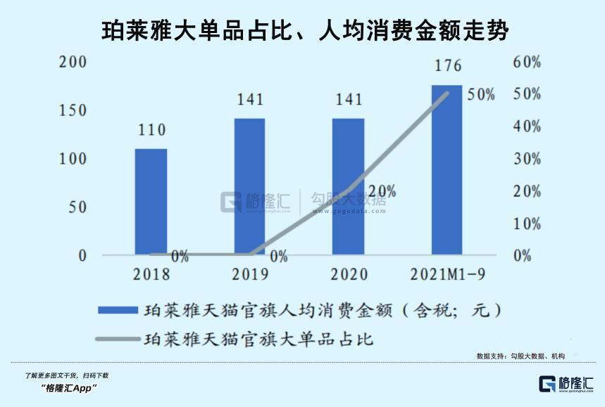 2021年,大单品在天猫渠道销售占比高达60%(2019年为0),在抖音渠道占比也高达50%左右,各渠道总计占珀莱雅品牌的35%以上。大单品的成功出圈,拉动销售客单价和复购率上升。据机构统计,天猫平台客单价从2020年的140元提升至2021Q3的176元,复购率从过去的20%提升至21Q3的29%。