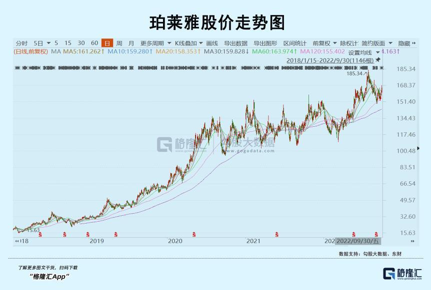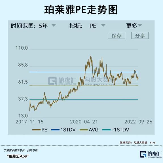 在今年A股大跌的背景下,市场给予珀莱雅的估值一点也不低,最新为71.8倍,位于该公司上市5年来估值中位线以上的水平。横向粗略对比,爱美客PE-TTM为95倍,贝泰妮73.6倍,丸美股份60倍。