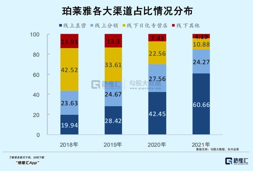 除了产品结构变化外,还有销售渠道的重大变化。2018年-2021年,珀莱雅线上占比从43.57%快速跃升至85.43%,高于贝泰妮的82.34%、丸美股份的59.54%、上海家化的42.24%。而线上主要是直营渠道为主,从2018年的19.94%飙升至2021年的60.66%,该比例提升会拉动毛利率抬升。主营渠道中,天猫销量占比45%+,抖音15%+,京东10%+,分销渠道主要有天猫超市、京东主营、唯品会。