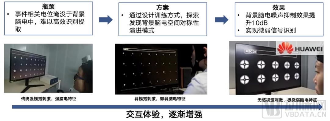 关键技术-精辨识:基于事件相关电位,针对难以识别的微弱信号,通过发现背景脑电空间对称性演进模式,可以对背景脑电噪声增大抑制效果提升,可以实现亚uV级极微弱脑电信号(约0.5uV)的解码和应用,提升脑机操控交互的自然性。