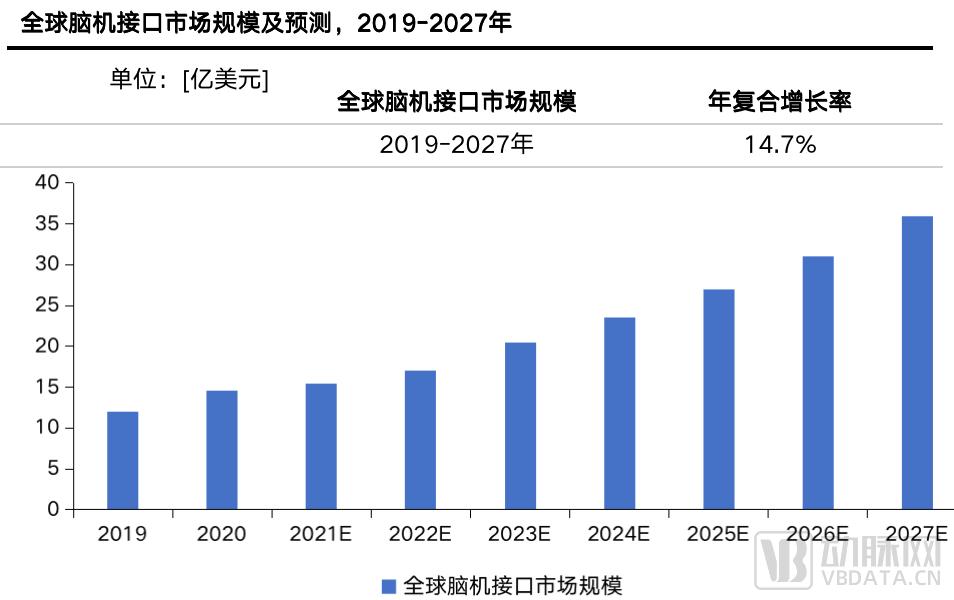 2020年全球脑机接口的市场规模达到14.6亿美元,预计到2027年市场规模达36亿美元,年复合增长率约为14%,行业市场规模大,增速快,脑机接口行业未来具有很大发展空间。