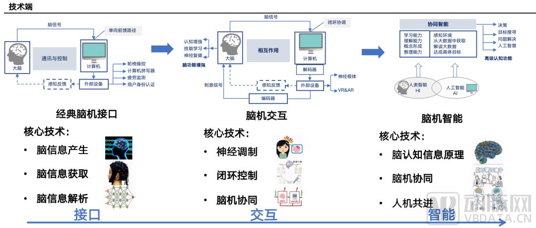 在脑机接口技术领域,未来脑机接口的发展按照信息传输方向分类,将从经典的脑机接口逐渐演变为脑机交互最后到脑机智能的模式。