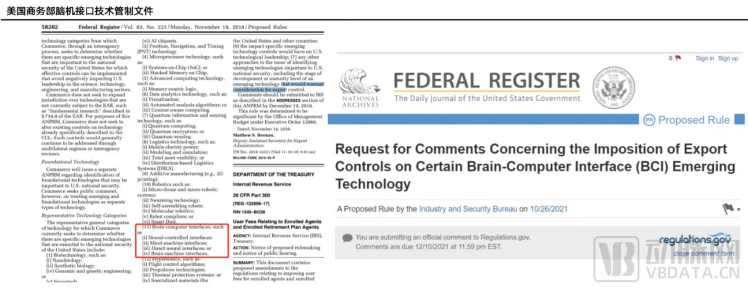 2021年10月26日,美国商务部工业和安全局发布预通知将脑机接口定为对美国国家安全至关重要的潜在新兴和基础技术,需对其适当的出口、再出口和转让(国内)管制。