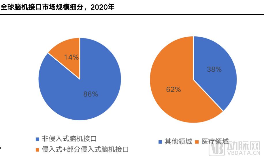 2020年,非侵入式脑机接口占脑机接口市场规模的86%。目前,受到脑机接口技术和伦理、安全等因素的制约,无论是各国科研院所还是企业,研究重点都侧重非侵入式脑机接口;当前脑机接口技术主要应用于医疗及健康保健场景,数据显示2020年脑机接口在医疗领域的市场规模占比达62%。