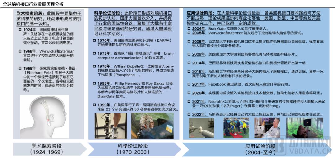 脑机接口技术的发展可以划分学术探索阶段、科学论证阶段和应用实验阶段。