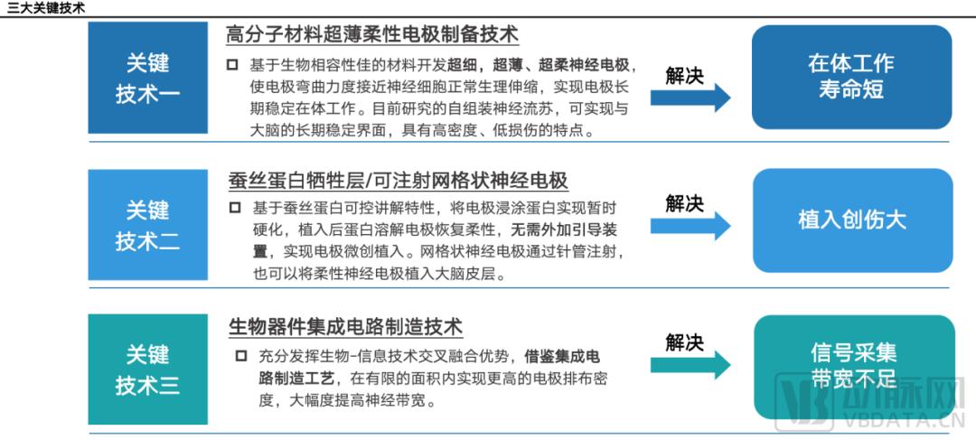 当前侵入式脑机接口技术面临电极在体工作寿命短、植入创伤大、信息采集带宽不足三大技术困境,针对侵入式脑机接口当前存在的技术挑战,研发三大关键技术可以有效解决。
