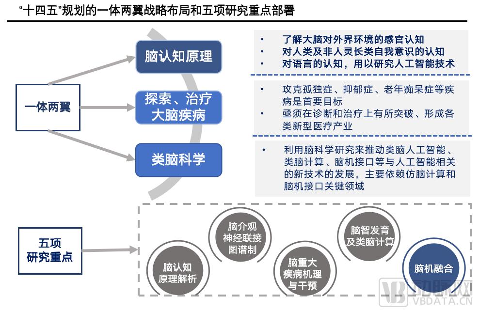 国家“十四五”规划部署五项研究重点领域,其中脑机融合纳入重点技术研究范畴;2021年,我国正式启动了百亿级的科技创新2030重大项目“脑科学与类脑研究”,当前中国脑计划研究已进入实际落地阶段。