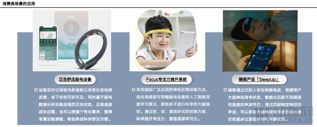 当前,针对非侵入式脑机接口技术已经开发出各种可穿戴设备,可以实时的监测用户的脑电状态。基于不同的用户需求,已经可以帮助进行日常解压、小孩专注力提升及睡眠障碍人群进行改善,在一些场景已经实现消费端的应用,未来可期待扩展到更多的健康消费场景。