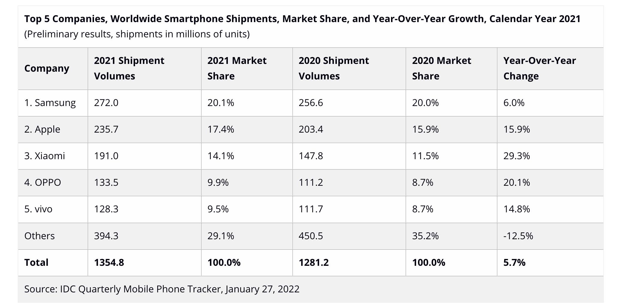 IDC的数据显示,苹果2021全年的iPhone销量为2.35亿台,全球市场占比为17.4%。而Counterpoint称,苹果拿走了手机全行业40%的营收和75%的利润。在利润和销量上,苹果更看重的是前者。