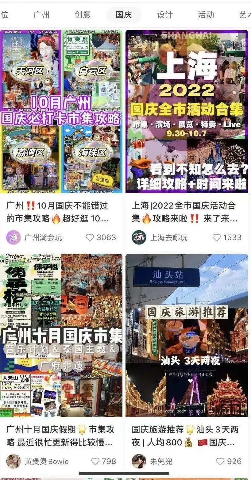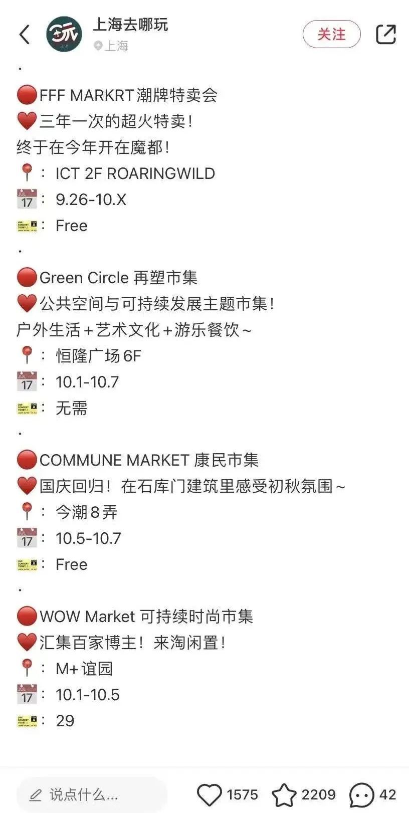 而在国庆长假的加成下,市集更成了各大城市争奇斗艳的流量赛场。在小红书上,各地关于国庆市集的笔记已经快速窜红。不少人都依着笔记的指引,去看上的市集打卡,赏玩。