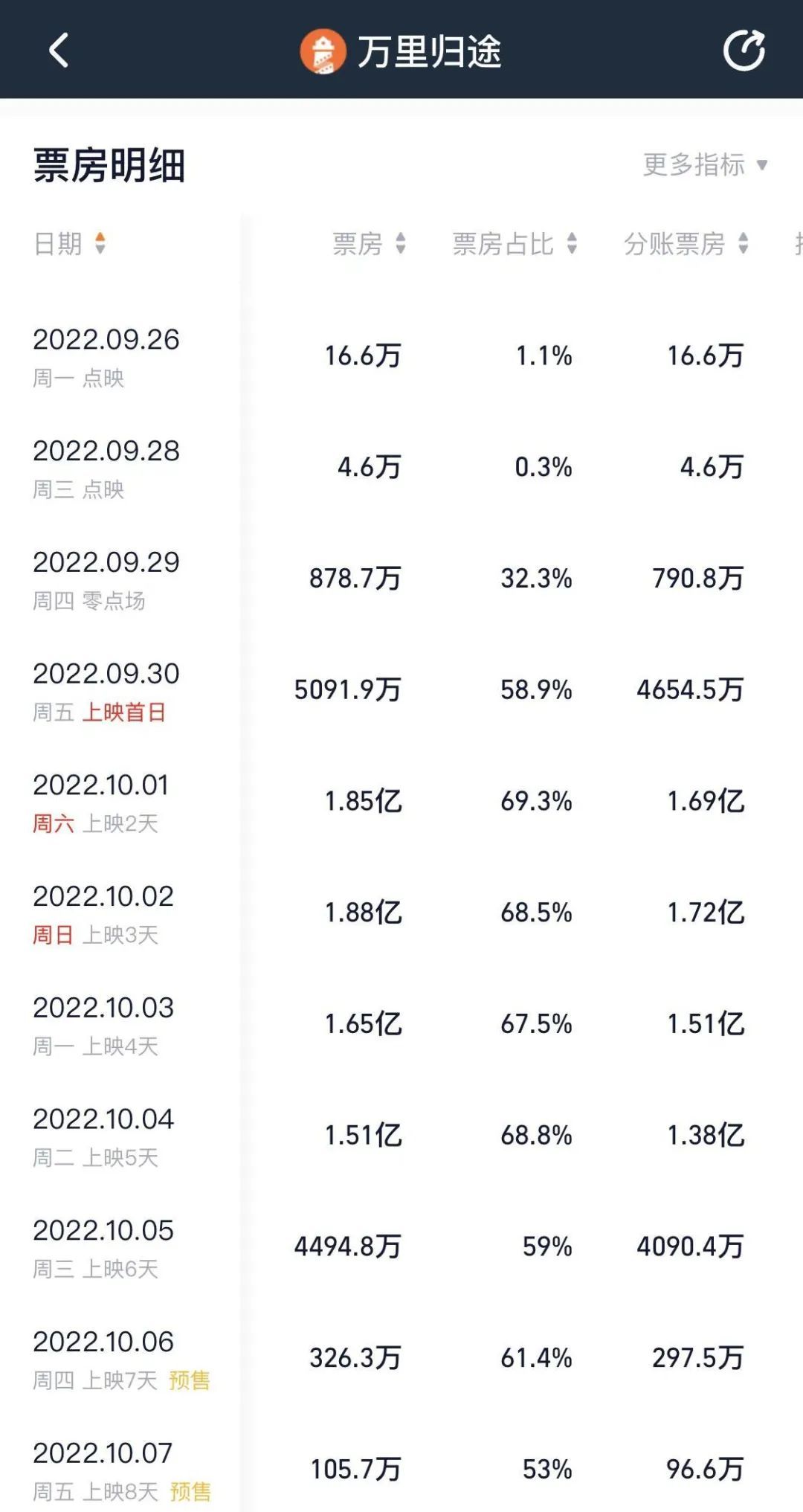 扣除《长空之王》的预售票房后,根据猫眼专业版数据显示,截至9月30日20时56分,2022年国庆档(10月1日-10月7日)预售票房破5000万。电影《万里归途》票房占比最高。