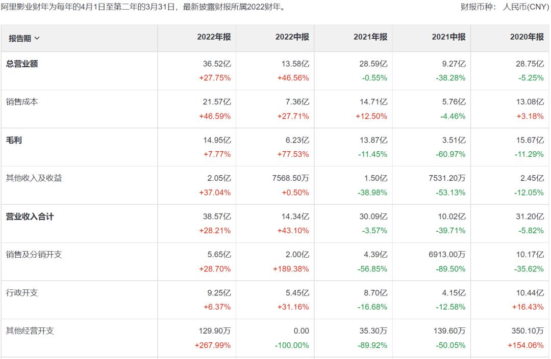 出品方之一的阿里影业在7月27日公布的2022年财报披露,公司2021年4月1日-2022年3月31日实现营业收入36.52亿元,同比增长27.75%,归属母公司净利润1.70亿元,同比扭亏为盈,去年同期亏损9631.10万元,基本每股收益为0.0064元。