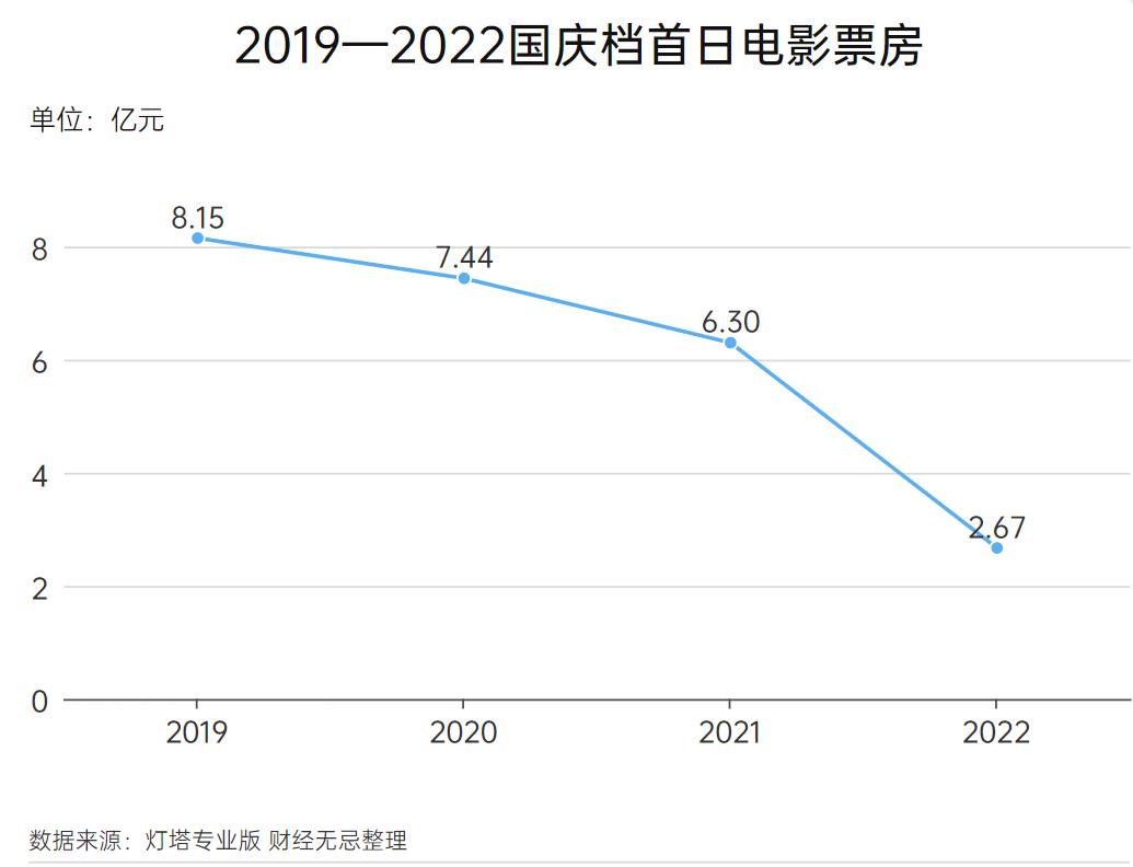 2020-2022年,国庆档首日(10月1日)票房表现分别为7.44亿元、6.30亿元与2.67亿元,疫情前的2019年10月1日票房为8.15亿元。