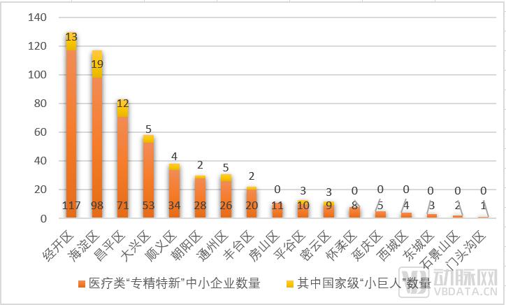 首先,医疗类“专精特新”中小企业数量最多的是经济技术开发区117家,海淀区位居第二98家。而从医疗类国家级“小巨人“数量来看,海淀区以19家的数量位居第一,经开区13家紧随其后。