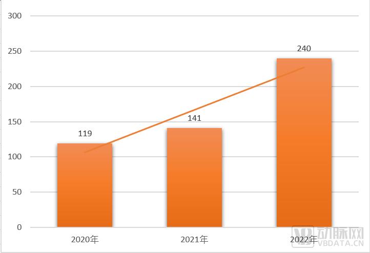 2020年到2022年,北京市医疗类“专精特新”中小企业数量呈递增趋势,从2020年的119家,增长到2021年141家,2022年为240家。