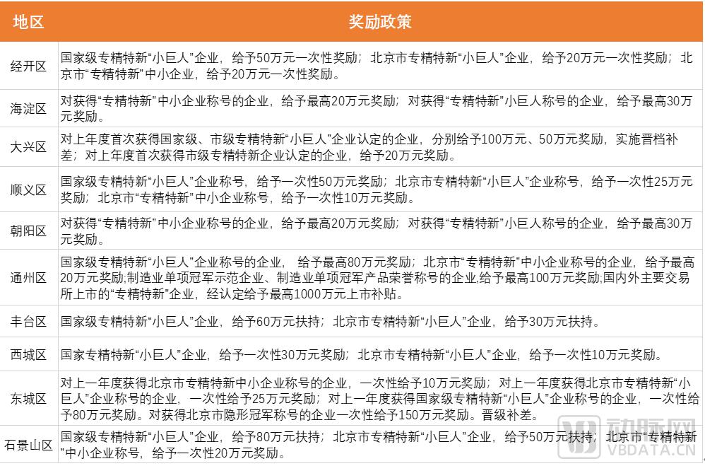 北京市各区“专精特新”奖励政策(不完全整理)
