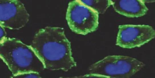 照片中,被标记的聚糖是绿色的,蓝色的部分则是细胞核|Proc Natl Acad Sci USA (2007) 104:16793–16797