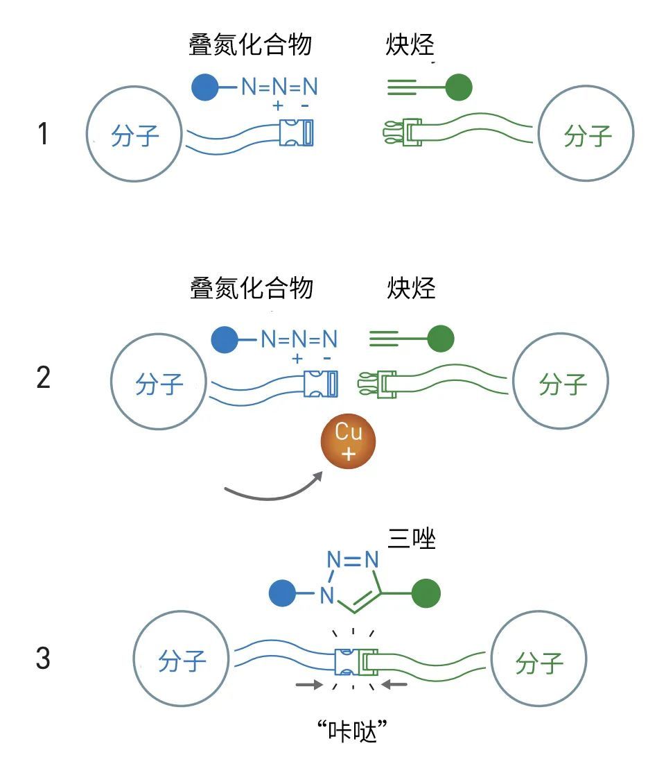 在这里,两边分子上的“插头”分别是叠氮基团和炔基。只要有亚铜离子催化,它们很容易连接起来,形成稳定的三唑结构。这就像是插扣很容易插到一起,同时又不容易被拉开。