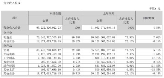 从今年的财报来看,过去几年的“不务正业”,并没有为格力的业绩做出像样的贡献。2022年上半年,格力952.20亿元的营收中,制造业占比达80.18%。单一的空调类产品就贡献了72.2%的营收,而生活电器、工业制品和绿色能源等其他产品累计占比不到8%。