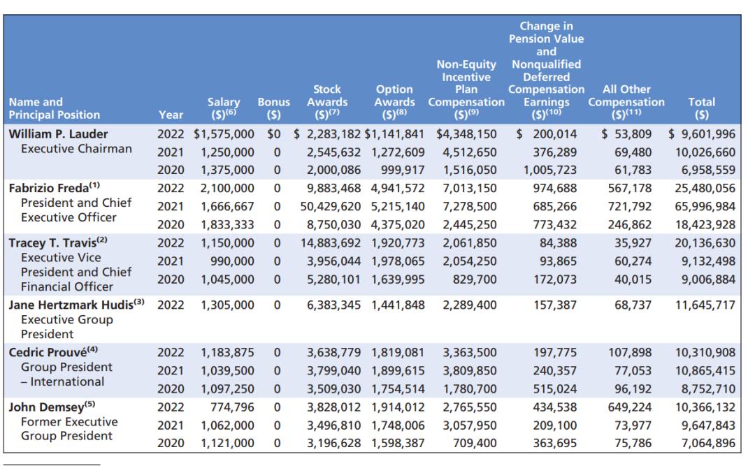 雅诗兰黛集团管理层2020-2022年薪酬表,截自雅诗兰黛集团官网