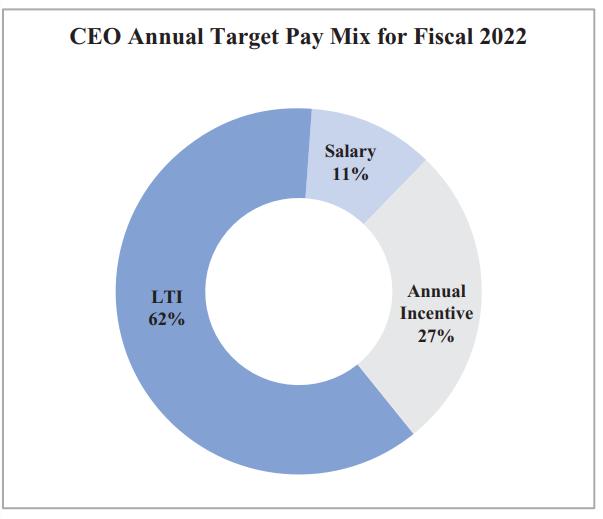 在财报文件中,雅诗兰黛指出,2022财年中,傅懿德(Fabrizio Freda)目标薪酬中89%是基于业绩的。