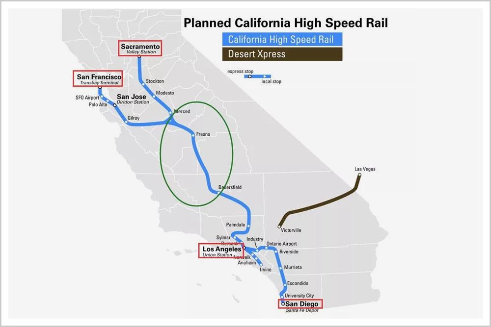 ▲加州高铁项目红框中为原定计划连接的几大城市,绿色圆圈内是中央山谷一段来源:洛杉矶时报