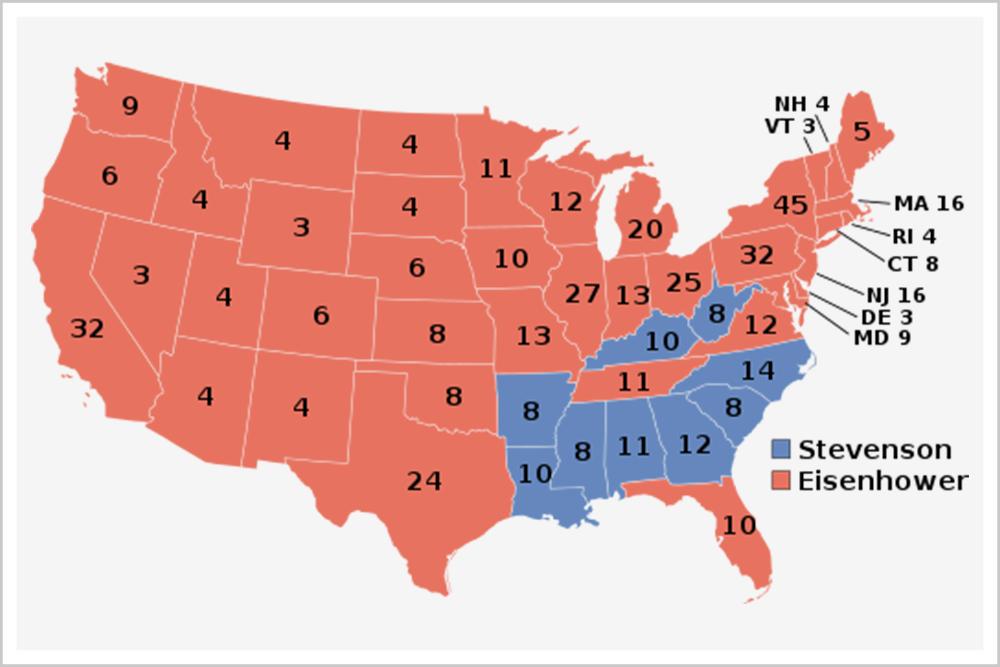 艾森豪威尔虽然以共和党的身份竞选获胜,但即便像加州这种民主党大本营,也支持了他。因此,与其说艾森豪威尔的当选是共和党的胜利,不如说它符合民主党和共和党的共同利益。