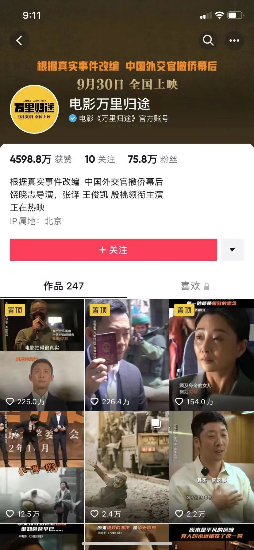 官方宣发不足,粉丝宣发来补。过往,粉丝向影片如肖战主演的《诛仙》,有粉丝在31 个城市启动包场观影。今年,“顶流出演主旋律大片”的惯例下,《万里归途》尤为引人瞩目。