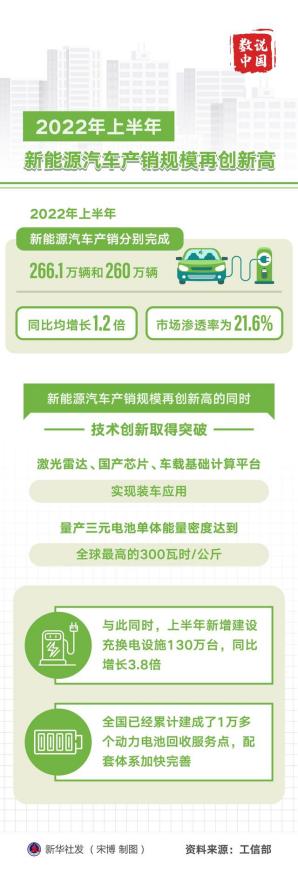 最直接的体现是2022年上半年新能源汽车产销规模再创新高:工信部数据显示,新能源汽车产销分别完成266.1万辆和260万辆,同比均增长1.2倍,市场渗透率为21.6%。