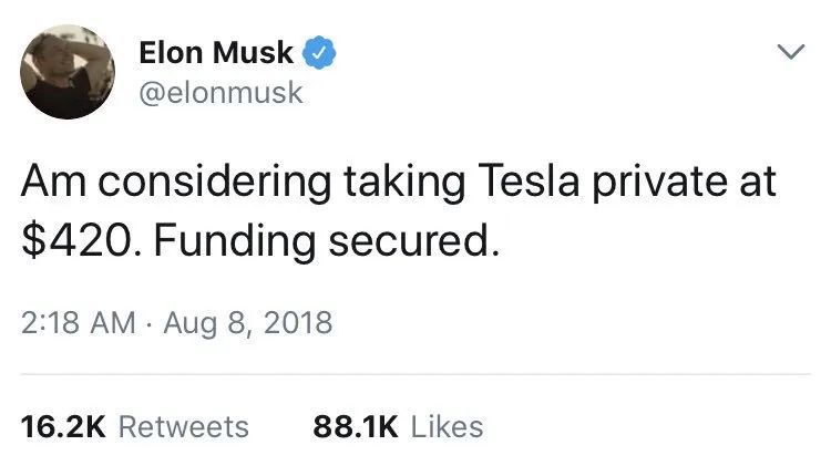 2018年马斯克虚假宣布私有化,让特斯拉空头们损失惨重