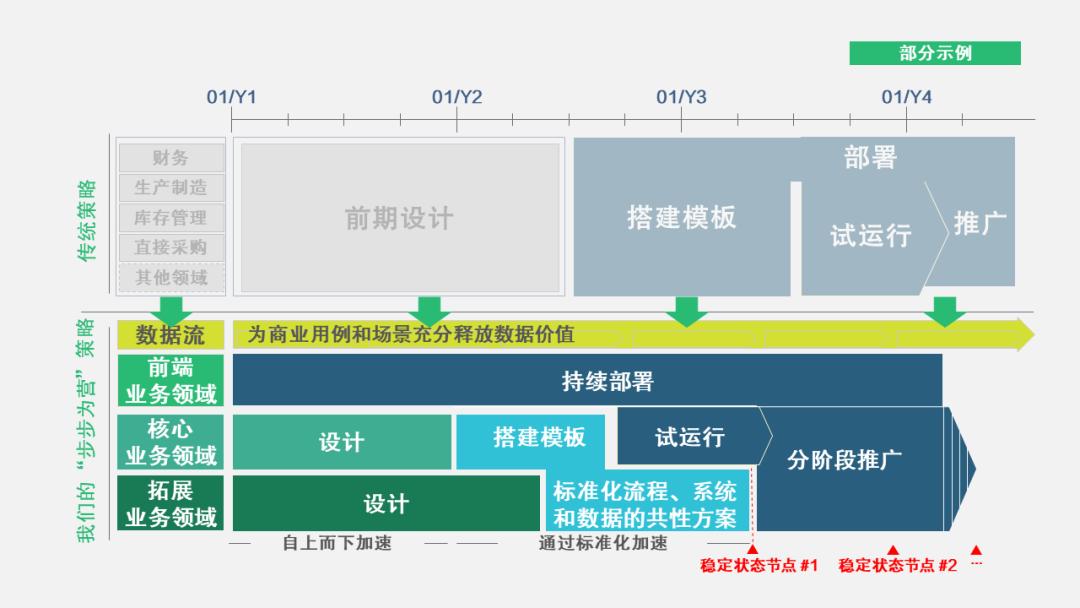 BCG帮助这类企业制定为期数年的“下一代ERP”实施路线图(下图仅为示意),并运行ERP转型的项目管理办公室(PMO),管理实施中的业务和技术重大变革决策,确保实施方案的先进性,驱动集团业务流程标准化以及流程和数据治理。