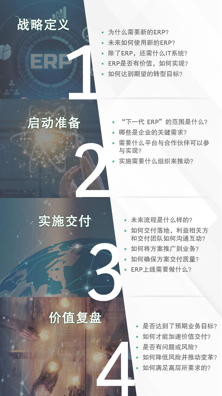 所以,用正确的方法来推动整个ERP转型尤为重要。我们总结了ERP转型常见的四个阶段中,企业需要解答的核心问题以及制胜实践: