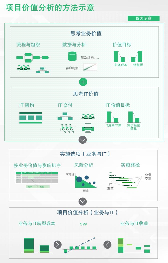 项目价值分析:在这一阶段,还需分析论证ERP转型的价值以及投资回报率,通常可以从财务类与非财务类收益等维度进行转型的价值分析,评估项目是否值得投入,也可让利益相关方看到并认同转型的价值。