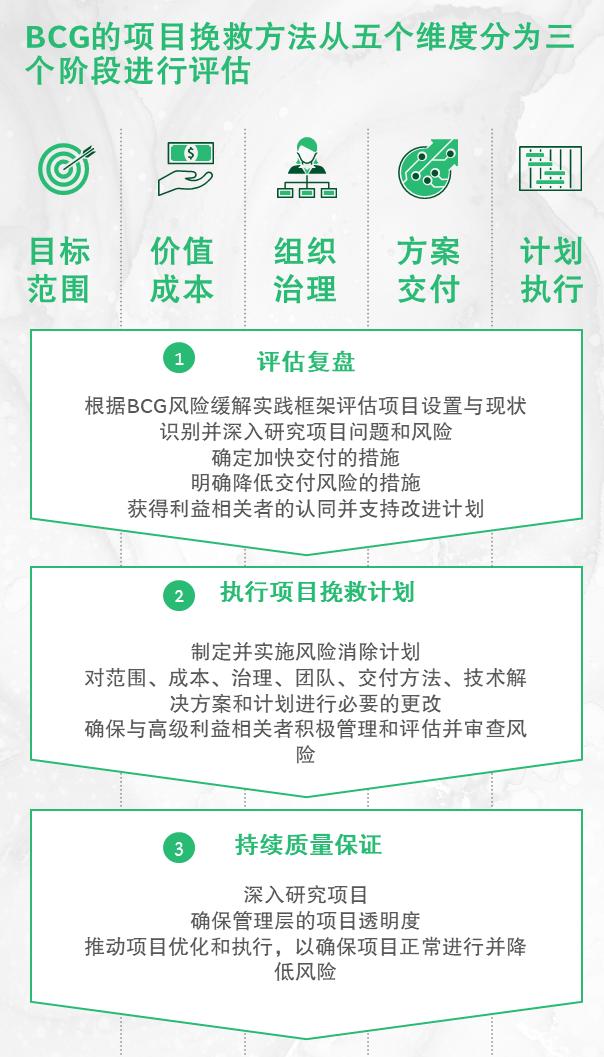 如企业在ERP项目中遭遇困境,BCG拥有完备的“项目挽救”(de-risking)方法协助企业走出困境;项目上线后,如果价值未达预期,BCG也可以帮助企业诊断根本问题所在,扭转ERP转型困局。