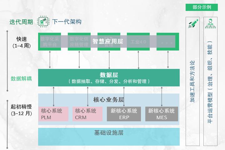 DDP采用双速模式区分不同业务要求的实现方式:智慧应用层——敏态;核心业务层——稳态。