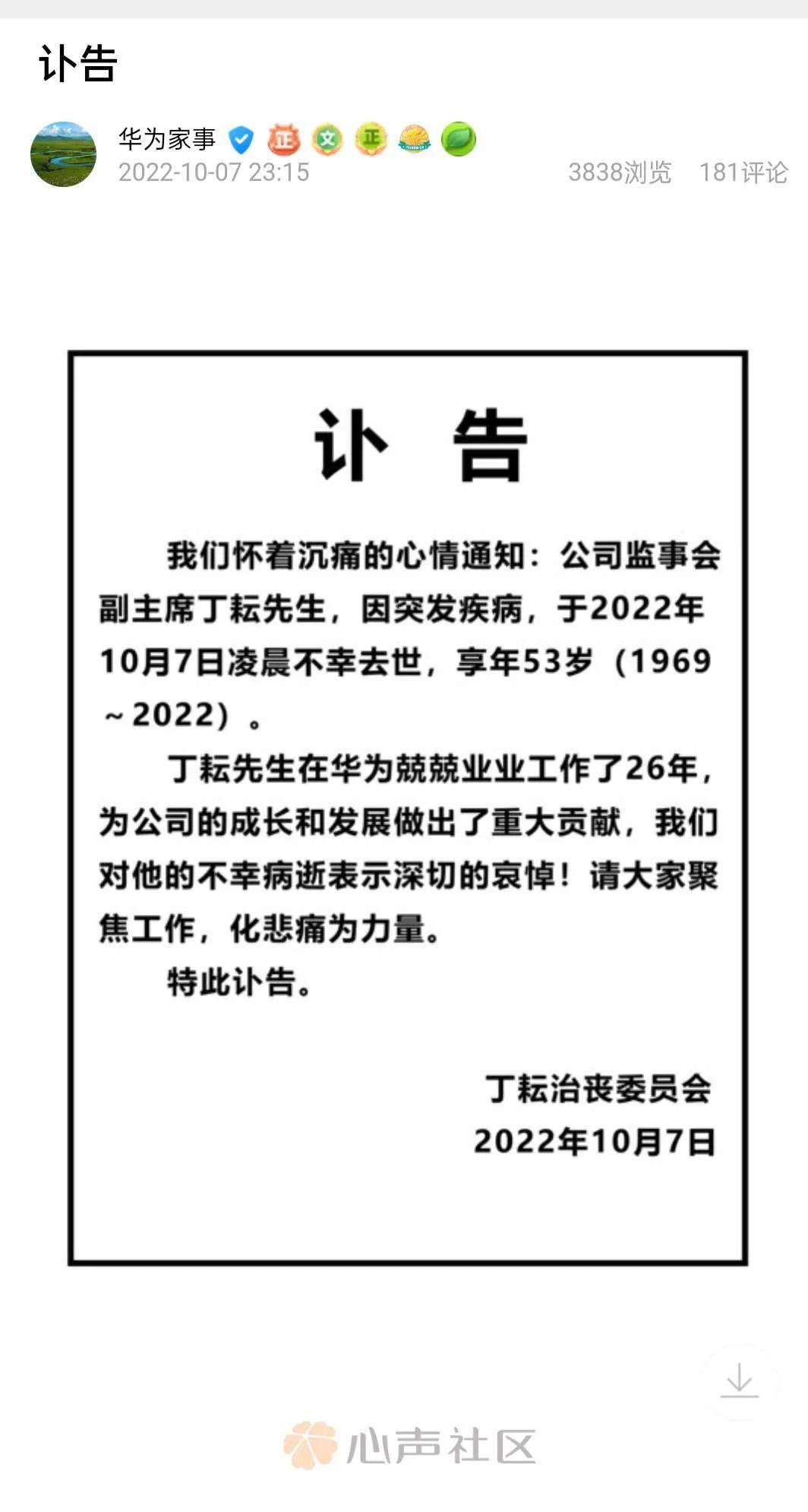 10月7日23点15分,华为在心声社区发布讣告:我们怀着沉痛的心情通知,丁耘因突发疾病,于2022年10月7日凌晨不幸去世,享年53岁(1969~2022)。“丁耘先生在华为兢兢业业工作了26年,为公司的成长和发展做出了重大贡献,我们对他的不幸病逝表示深切的哀悼!请大家聚焦工作,化悲痛为力量。”
