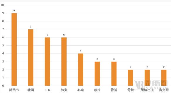 医疗三类证总量随时间推移不断上升,其同质化水平也不断加剧。49款AI产品总计涉及15个辅助诊断场景,其中,基于CT影像的肺结节AI多达9个,其次是借助眼底相机进行诊断的糖尿病视网膜病变AI,有7家企业拿到了市场的准入许可。CT-FFR、CT肺炎紧随其后,各有6家三类证,除AI心电领域乐普医疗独下4张三类证外,放疗、骨折、骨龄、颅脑出血、青光眼五个场景均有不止一家企业的AI产品通过审评审批。