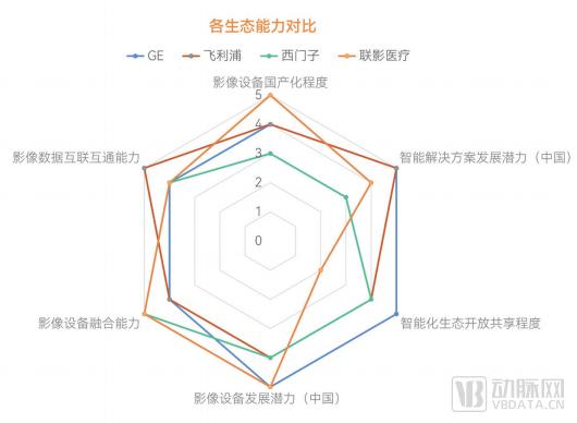 目前国内比较成熟的影像生态主要由GE医疗、飞利浦医疗、西门子医疗、联影医疗四家企业构建,各企业在影像设备国产化程度、智能解决方案发展潜力(中国)、智能化生态开放共享程度、影像设备发展潜力(中国)、影像设备融合能力、影像数据互联互通能力上各有千秋。