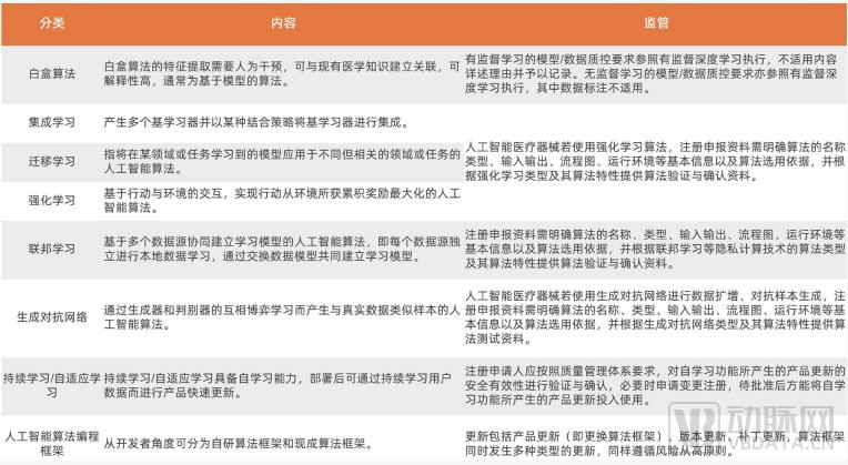 另一方面,国家药监局器审中心于2022年3月7日发布了的《人工智能医疗器械注册审查指导原则》(后简称《指导原则》)重新描述了人工智能医疗器械的概念、注册基本原则、人工智能医疗器械生存周期过程、技术考量等部分。值得注意的是,该政策对人工智能审批适用的算法进行了完善,在深度学习的基础上加上了迁移学习、集成学习、联邦学习、强化学习、生成对抗网络、自适应学习。