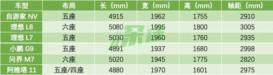 自游家NV长宽高为4915/1962/1755mm,介于小鹏G9和理想L7之间,轴距为2910mm,整体上属于这堆中大型SUV中尺寸既不出色也不算拉胯的一款。