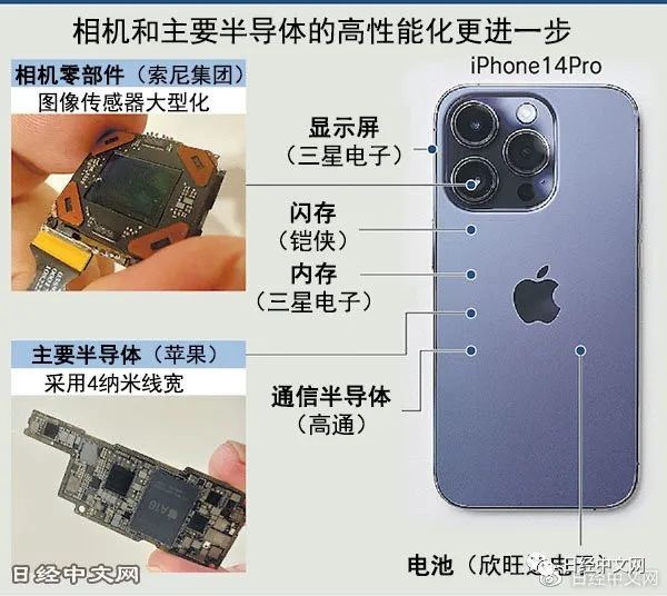 日本经济新闻(中文版:日经中文网)拆解调查了苹果新款智能手机iPhone 14的旗舰机型,发现零部件总成本较2021年推出的机型增加了约2成,创历史新高。由于新款iPhone 14缺乏新功能,苹果的策略仍是以超高性能器件为卖点,例如电路线宽为4纳米的自行设计半导体和相机零部件等。但在美国等市场没有提高价格,给利润率带来压力。