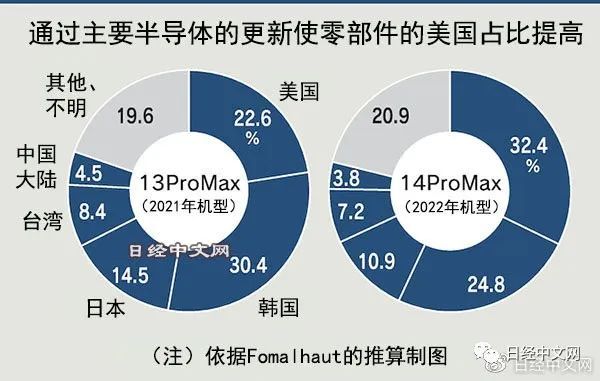 按国家和地区划分主要部件在新款iPhone成本中所占比例,美国为32%,比去年的机型高出约10个百分点。这是由于昂贵的半导体价格上涨的影响。2021年份额居首的韩国下降了5个百分点,降至25%。苹果越来越多采用自产零部件,导致美国的采购比例上升。