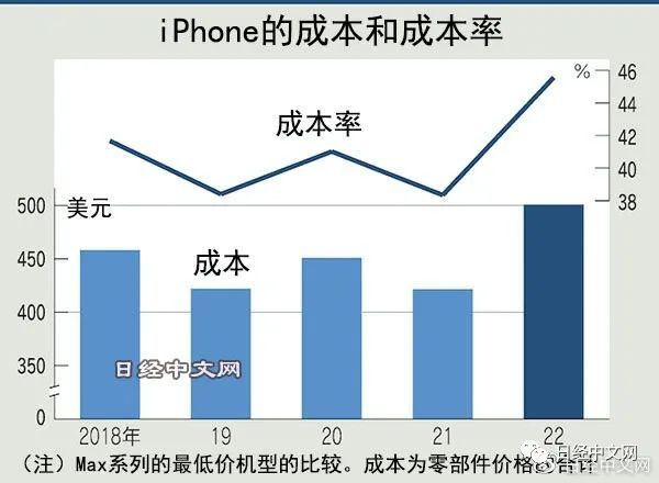 虽然iPhone在日本市场的价格逐年上涨,但苹果在美国市场把14 Pro Max的最低容量机型的价格保持在1099美元,这与2018年的同等型号Xs Max相同。零部件价格的上涨并没有直接转嫁到销售价格上,这成为压低利润率的一个因素。