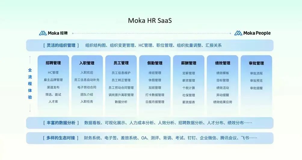 Moka也不例外,在连续几年接受了大量融资后,Moka于2019年组建产研团队,2020年年底正式发布新产品——Moka People智能化人力资源管理系统。目前这款产品已包括招聘管理系统、核心人事管理系统、人力数据洞察与分析平台等。这意味着Moka正式从过去专注智能招聘管理系统的单模块厂商,转向 HR SaaS 一体化。