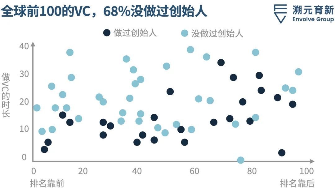 2016年开始,CB ingishts就开始采访数千个创业者或者投资人,以保密的形式评出“全球百大投资人”。与福布斯排行版不同,CB insights会对投资人的数据和背景进行量化分析。2018年他们通过研究发现,是否创立过公司和能否跻身榜单没有相关性。100人中,有32个人创立过公司,68个没有创立过公司。排名前十的投资人,有一半以上(6个人)都没有创立过公司,甚至没有在企业里干过具体业务。