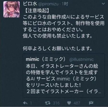 其一,大量画师宣布抵制AI。今年8月29日,一个名叫mimic的AI绘画网站上线了测试版,允许用户上传15至100张图像让AI进行学习,然后输出相同画风的AI画作。然而一些未经授权的画作也被上传学习,把AI生成的画作当做自己的创作进行售卖。随后又出现了有人将刚刚去世的画家尚在版权保护期间的作品上传给AI学习,这些动作相继引发了大批原创作者的不满,从而抵制“AI学习”。