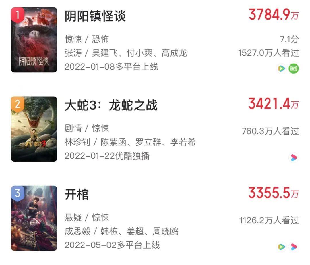 其中,暂居年度分账冠亚季军的《阴阳镇怪谈》《大蛇3:龙蛇之战》《开棺》三部作品无一例外都是带有惊悚或恐怖元素的影片,分账票房均达到了3000万以上。